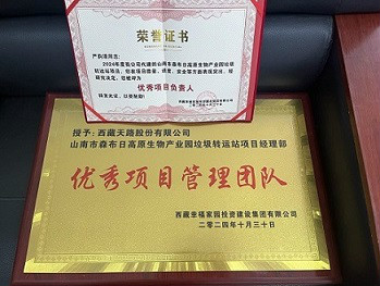 近日,西藏幸福家園投資建設集團有限公司向西藏天路股份有限公司山南市森布日高原生物產業園垃圾轉運站項目經理部授予“優秀項目管理團隊”榮譽稱號,向項目負責人嚴韻濠頒發榮譽證書,表彰其在項目質量、進度、安全等方面的優異表現。