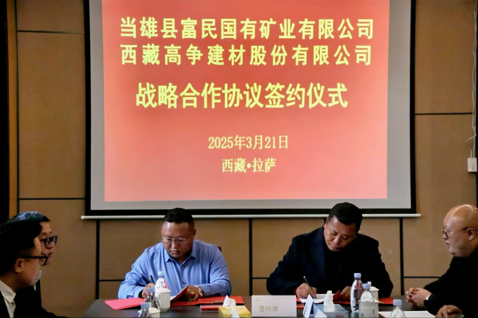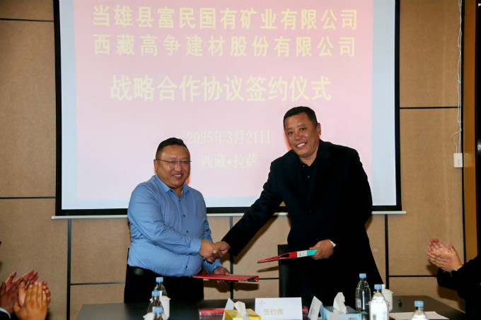 2025年3月21日,西藏高爭建材股份有限公司與當(dāng)雄縣富民國有礦業(yè)有限公司成功簽訂石膏礦股權(quán)投資戰(zhàn)略合作協(xié)議。當(dāng)雄縣縣委常委、副縣長戴然出席會議,高爭股份黨委書記、董事長扎西尼瑪,黨委委員、代總經(jīng)理旦增頓珠及經(jīng)營班子成員,當(dāng)雄富民礦業(yè)董事長赤列羅布及其經(jīng)營班子參加此次簽約儀式。