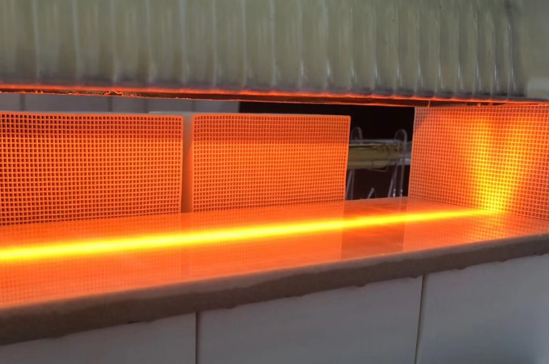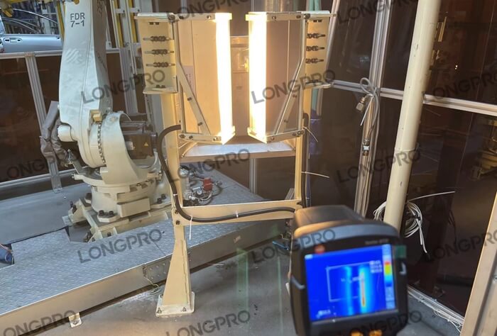 在待折彎的熱塑性預(yù)浸料板上進(jìn)行紅外線快速預(yù)熱軟化,雙面加熱,以達(dá)到折彎所需工藝要求。利用線型聚焦加熱器(加熱器聚集成一條高溫加熱線)的低能耗,高光強(qiáng),穿透力強(qiáng),控制簡(jiǎn)單等特點(diǎn),通過(guò)上下布置,快速精準(zhǔn)軟化所需的狹長(zhǎng)區(qū)域,尤其帶有厚度的預(yù)浸料折彎加工。